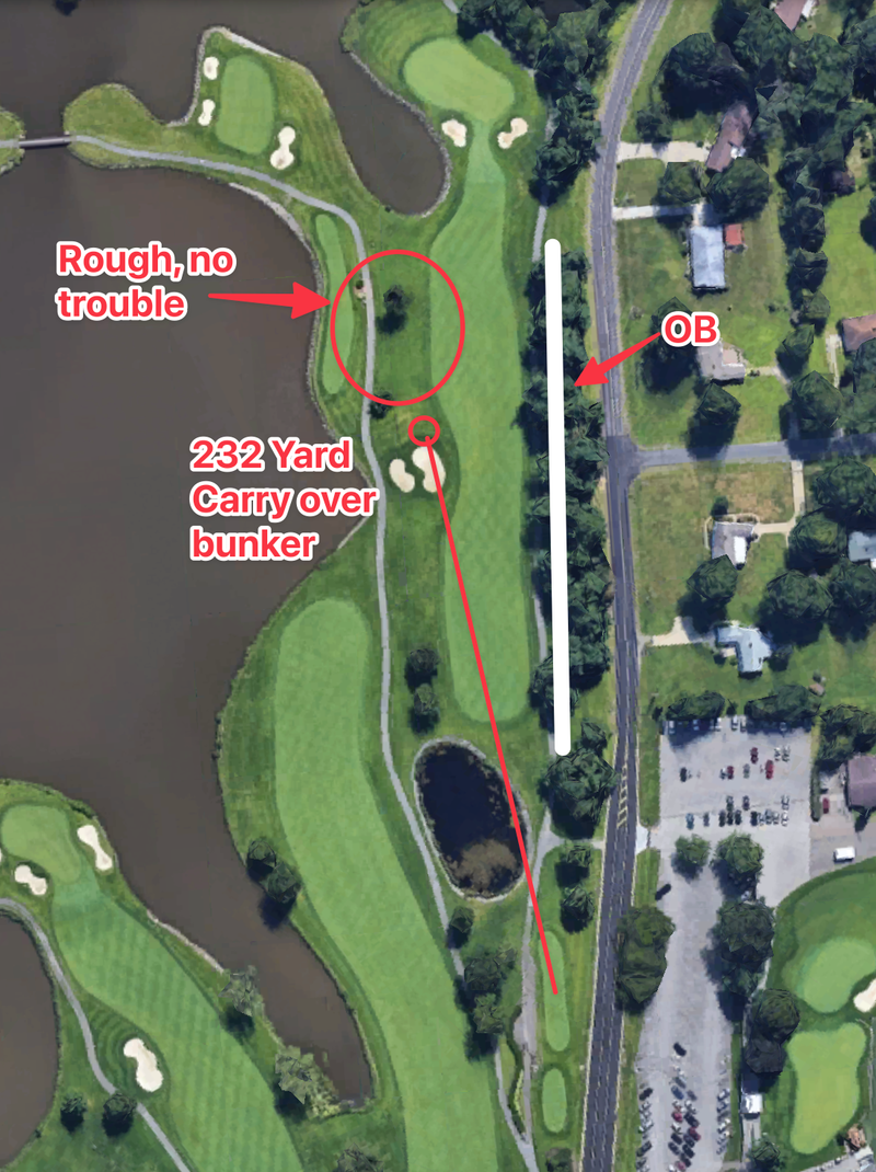 - Even if you manage to hook it 50+ yards left and hit it in the water left, this is still less penalizing than OB right (because you get to drop where the ball entered the water rather than re-teeing)